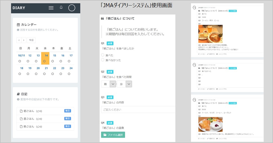 対象者ごとに個人ページを作成。SNSのような画面デザインで操作しやすく、パソコン、スマートフォン、タブレットなど各種デバイスにも対応しています。画像ファイルの添付も容易なため、毎日の食事や購買の記録も、ストレスフリーに行えます。