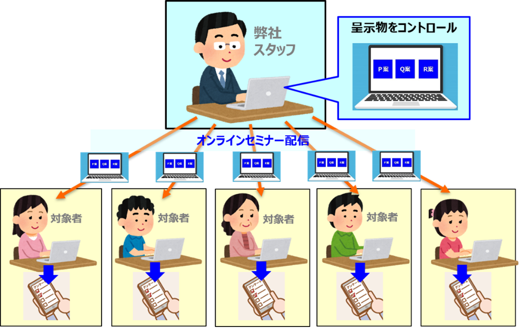 商品やサービスの解説をオンラインで配信・呈示し、リアルタイムで視聴している対象者がその場で評価、回答する調査です。